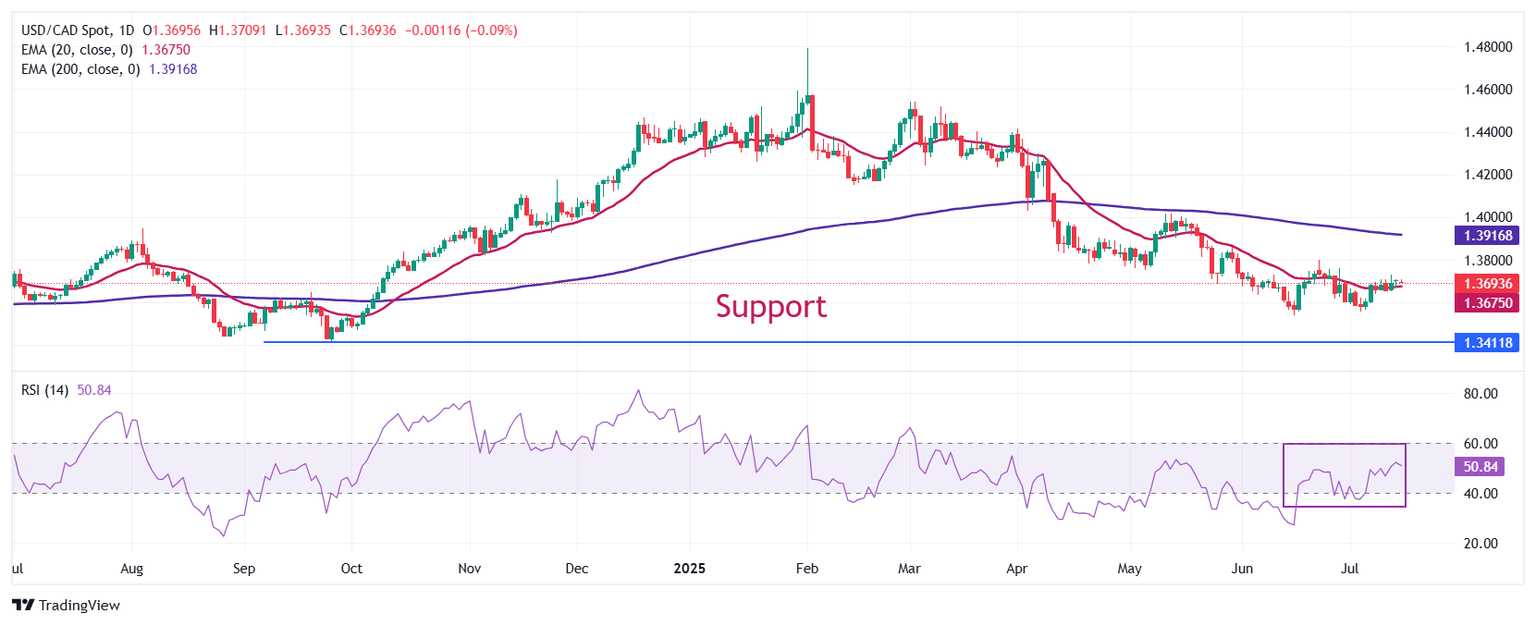 USD/CAD continues to trade in a range between 1.3638 and 1.3710 over the past week. The pair wobbles around the 20-day Exponential Moving Average (EMA), which trades close to 1.3675, suggesting that the near-term trend is sideways. However, the broader trend remains bearish as the 200-day EMA slopes downwards to near 1.3917.