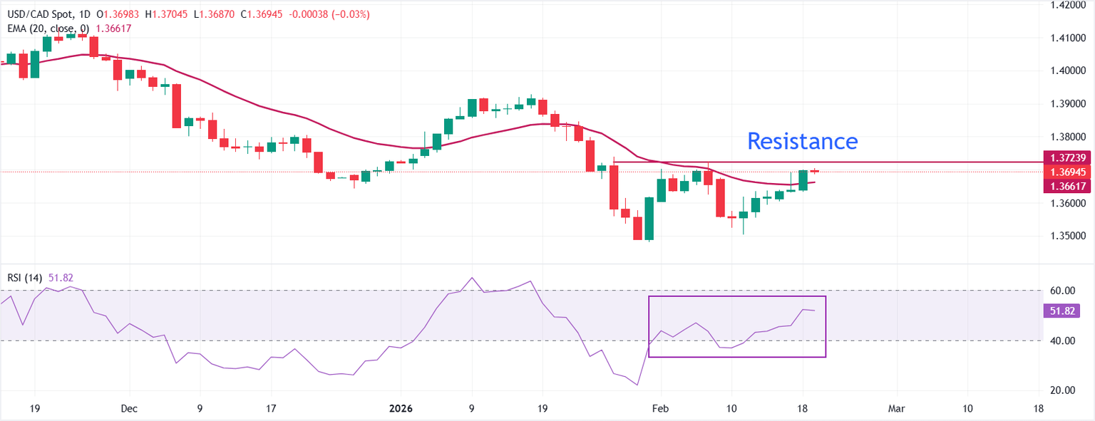 Price holds marginally above the 20-EMA, placing initial support at 1.3662. Looking down, the psychological level of 1.3500 will remain a key support area, while a sustained hold above the average could open room for an extension towards the February 6 high at 1.3740. The price could advance further towards the round-level figure of 1.3800 if it breaks and holds above 1.3740.
