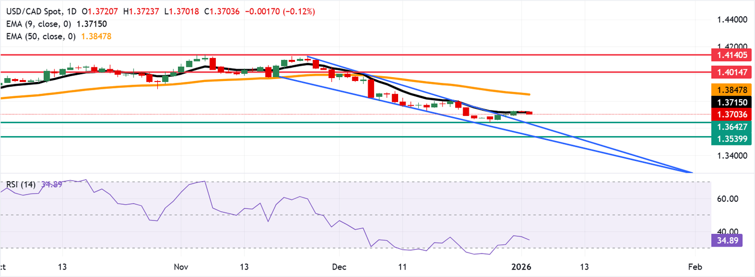 USD/CAD Price Forecast: Hovers around 1.3700 below nine-day EMA