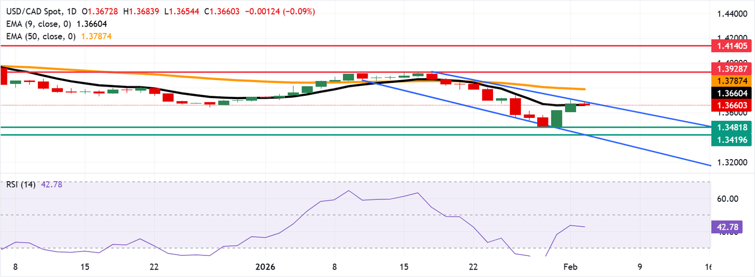 On the upside, the primary resistance lies at the nine-day EMA of 1.3660, aligned with the upper boundary of the ascending channel around 1.3700. A daily close above the confluence would open recovery scope and support the USD/CAD pair to approach the 50-day EMA at 1.3787. Further advances would expose the nine-week high of 1.3928, reached on January 16.