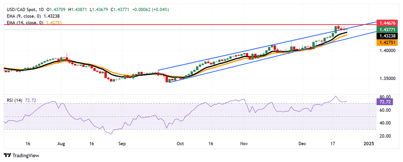 USD/CAD breaks its three-day losing streak, trading around 1.4380 during the European session on Tuesday. From a technical standpoint, the daily chart suggests that the USD/CAD pair is testing the upper boundary of an ascending channel, indicating a strengthening bullish bias.