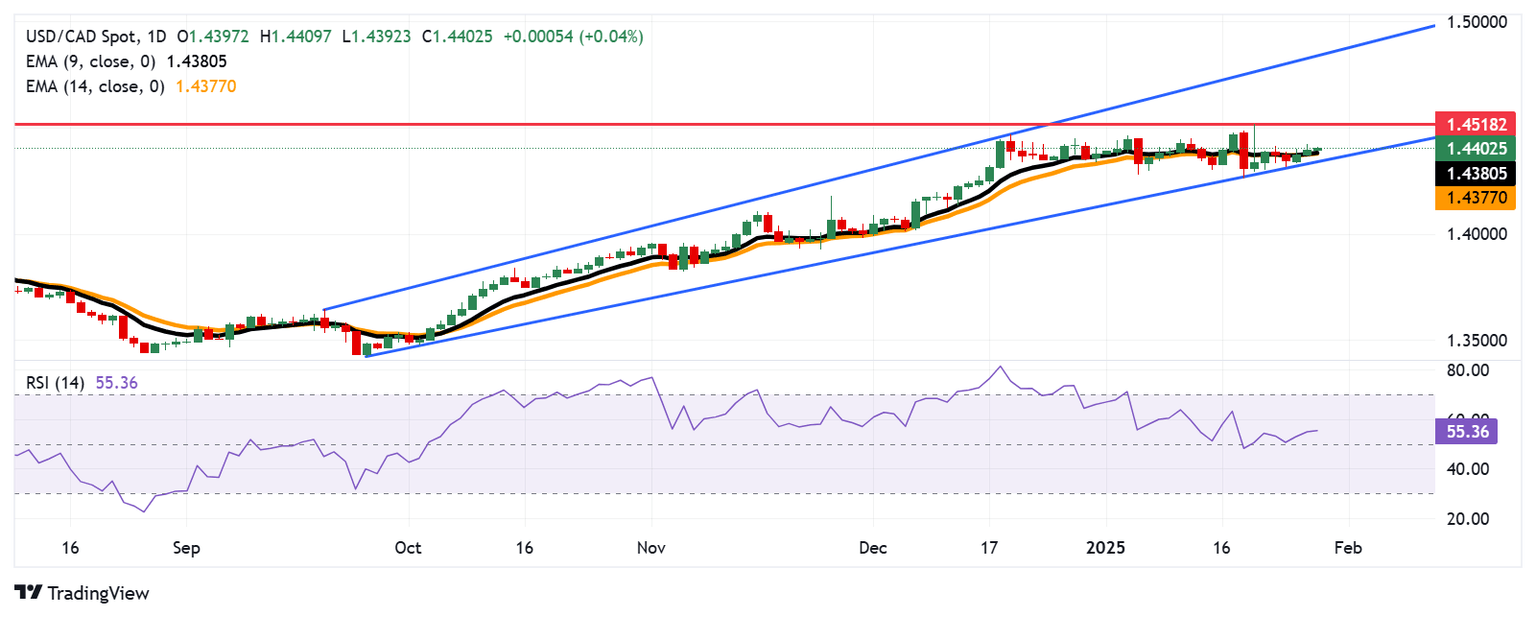 The USD/CAD pair maintains its position after two consecutive days of gains, trading close to 1.4400 during the Asian session on Wednesday. On the daily chart, the pair is within an ascending channel, indicating a prevailing bullish trend.