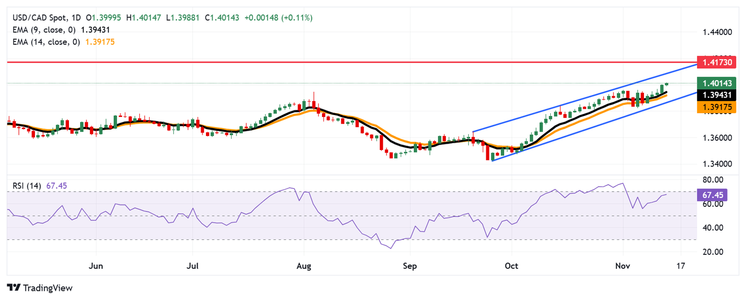 The USD/CAD pair gains ground for the fifth successive day, trading around 1.4010 during the Asian session on Thursday. On the daily chart, the analysis indicates that the pair moves upwards within an ascending channel pattern, suggesting an ongoing bullish bias.