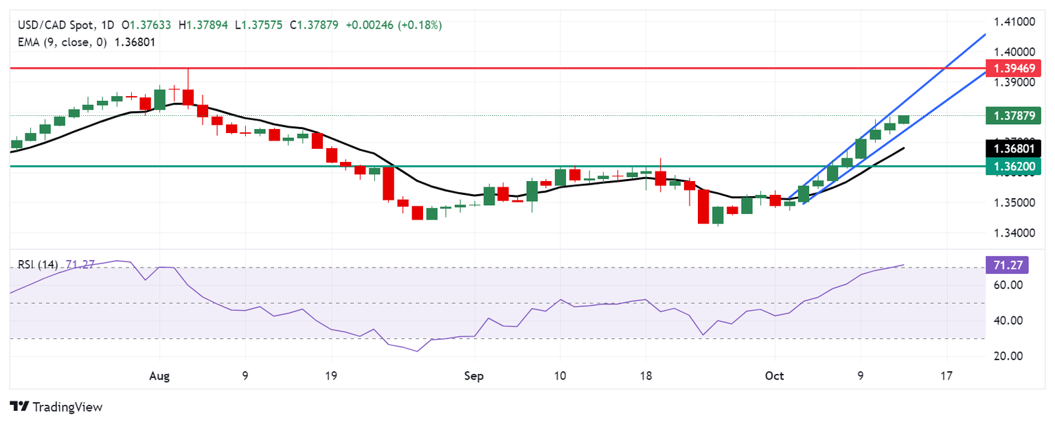 USD/CAD continues its winning streak that began October 2, hovering around 1.3790 during the European trading hours on Monday. The daily chart analysis shows that the pair is moving upwards within the ascending channel, suggesting the strengthening of a bullish bias.