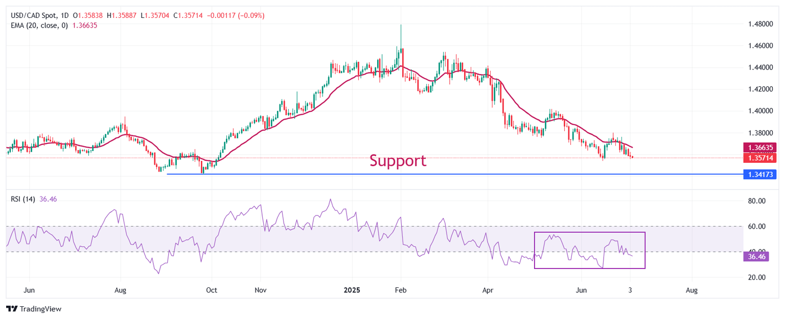 The USD/CAD pair trades lower to near 1.3570 during the European session on Friday, aiming to revisit the eight-month low around 1.3540. The Loonie pair faces selling pressure as the US Dollar (US) gives back its entire gains in the aftermath of the United States (US) Nonfarm Payrolls (NFP) data for June, released on Thursday.
