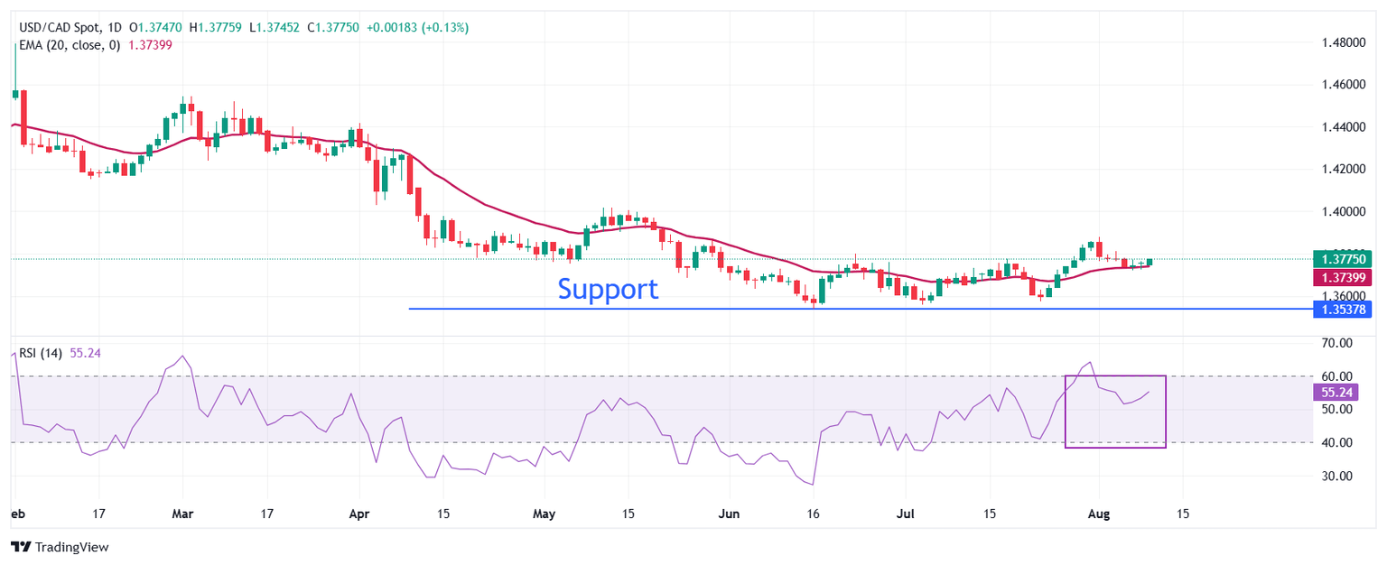 USD/CAD Price Forecast: Stabilizes above 20-day EMA around 1.3770