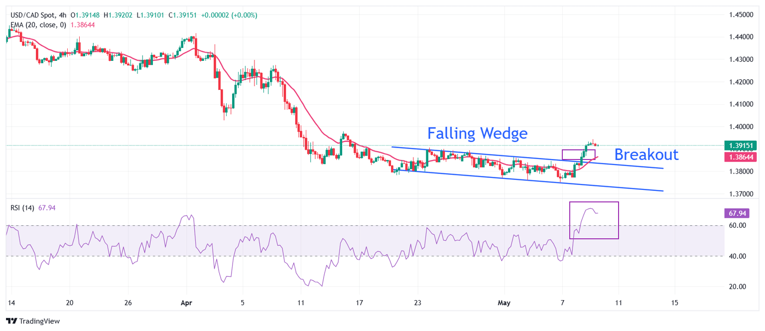 USD/CAD gains sharply after a breakout of the Falling Wedge chart pattern formed on a four-hour timeframe. Historically, a falling wedge breakout sets the stage for a bullish reversal. The pair extends its upside above the 20-period Exponential Moving Average (EMA), which is around 1.3860, indicating that the near-term trend has turned bullish.