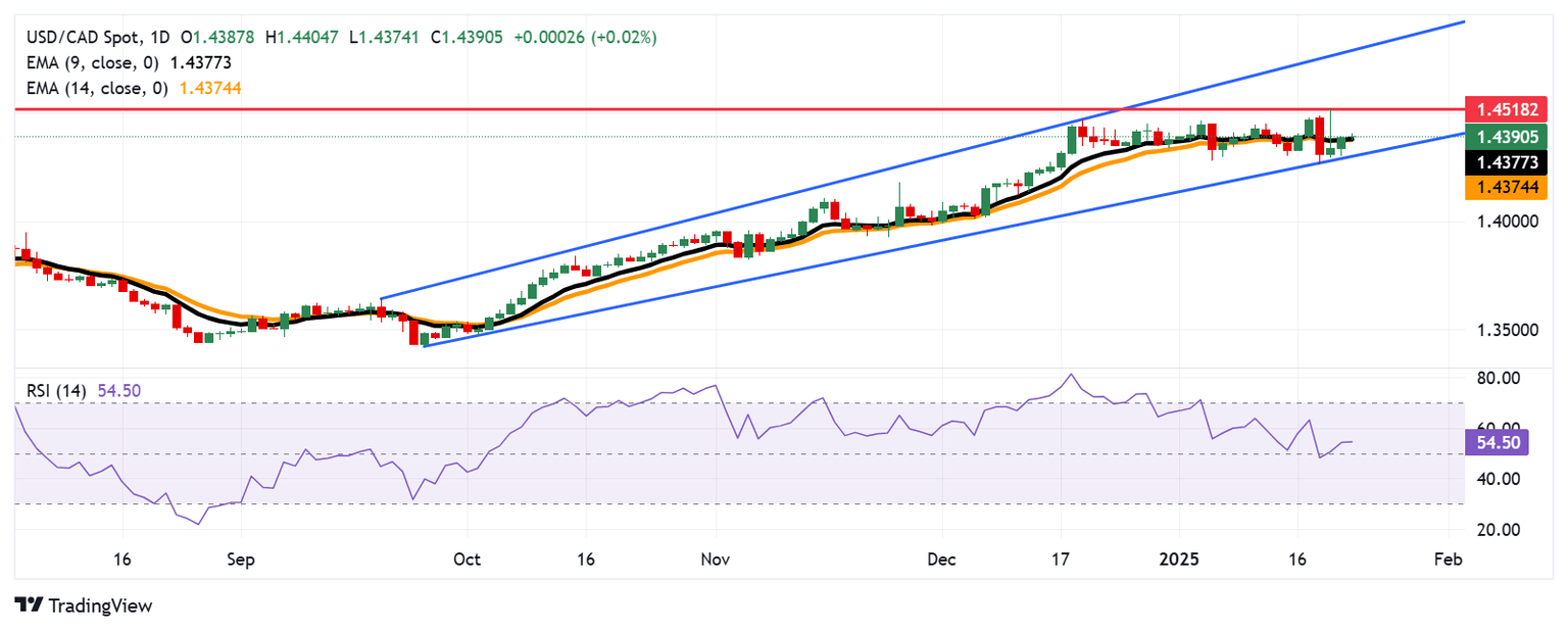 The USD/CAD pair continues its upward trend for the third consecutive session, hovering around 1.4390 during Thursday’s Asian trading hours. Technically, the daily chart shows the pair moving within an ascending channel, suggesting a prevailing bullish outlook.