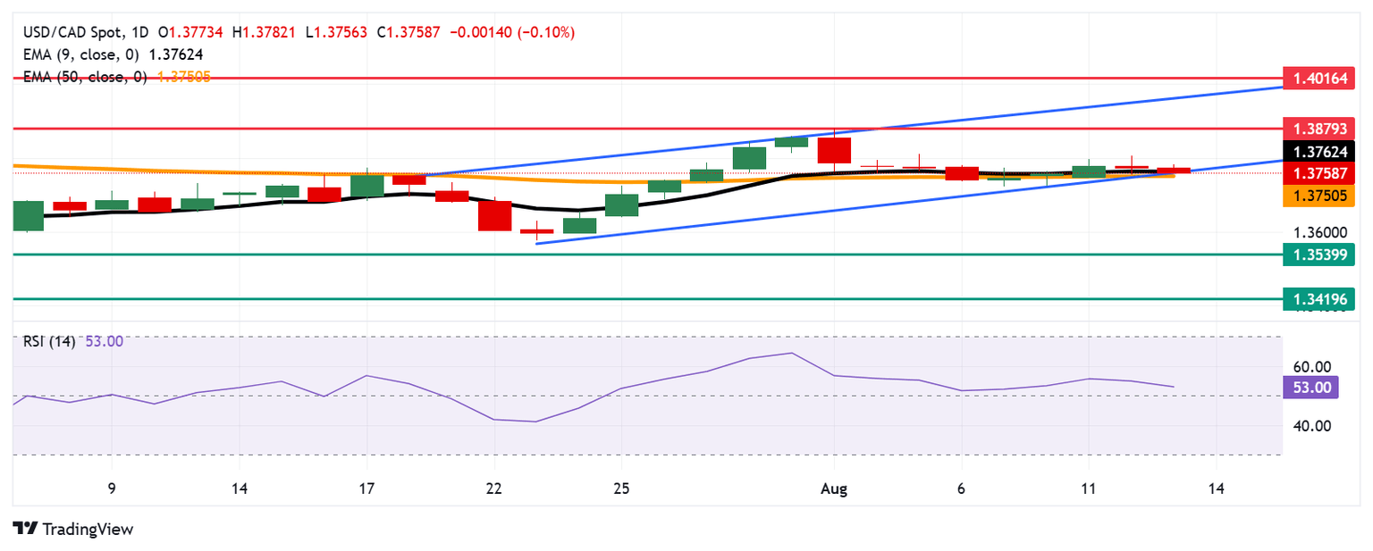 - USD/CAD tests the initial barrier at the nine-day EMA of 1.3762.