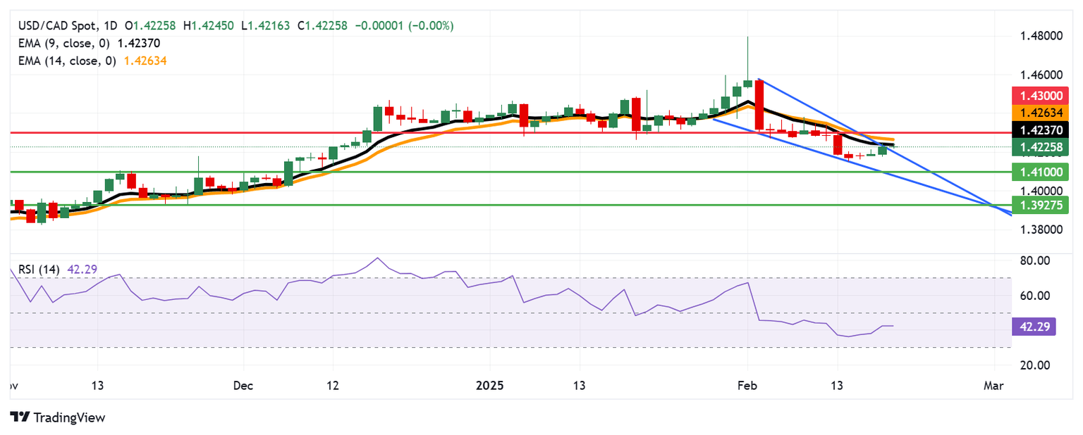 The USD/CAD pair faces immediate resistance at the nine-day EMA of 1.4236, followed by the 14-day EMA of 1.4262. A decisive break above these levels could strengthen short-term momentum, potentially pushing the pair toward the psychological level of 1.4300.