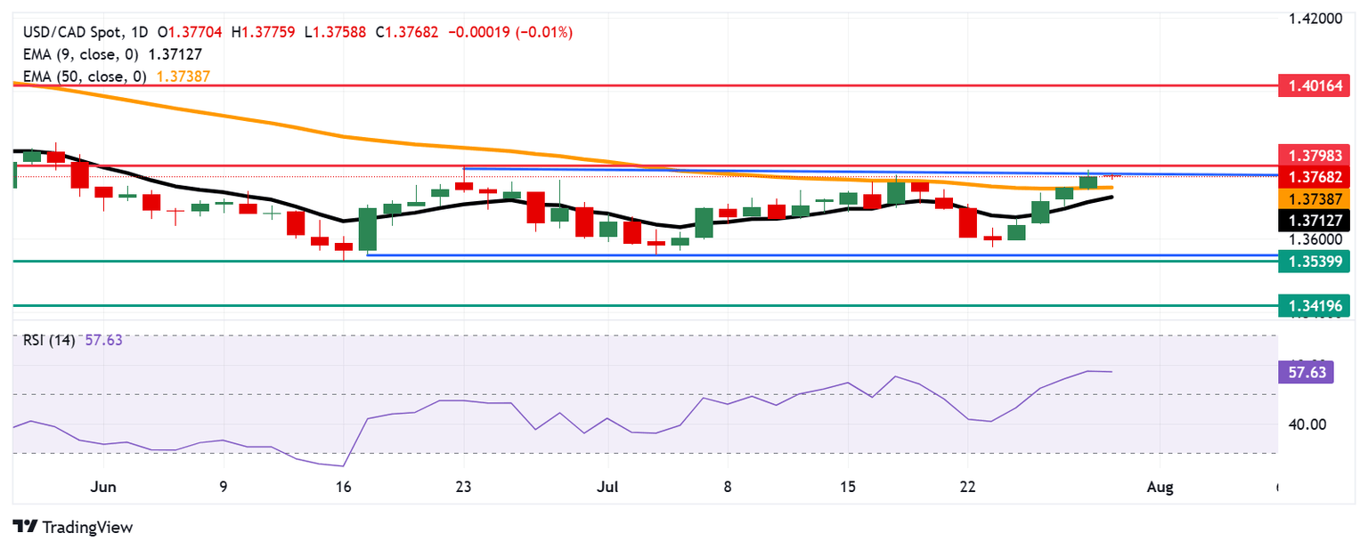 However, the 14-day Relative Strength Index (RSI) remains above the 50 level, indicating a bullish outlook. Additionally, the USD/CAD pair remains above the nine-day Exponential Moving Average (EMA), suggesting the short-term price momentum is stronger.