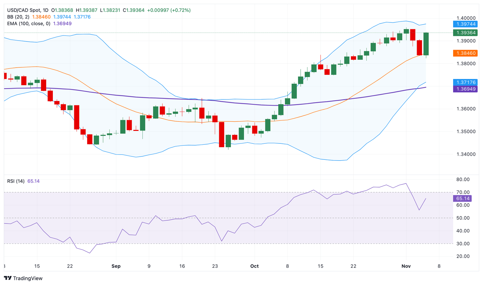 The USD/CAD pair gathers strength to near 1.3930 during the early European session on Wednesday. The US Dollar (USD) rises across the board on the day as Trump trades continue to gain momentum after the polls showed Republican candidate Donald Trump ahead of Democratic candidate Kamala Harris in the US presidential election.