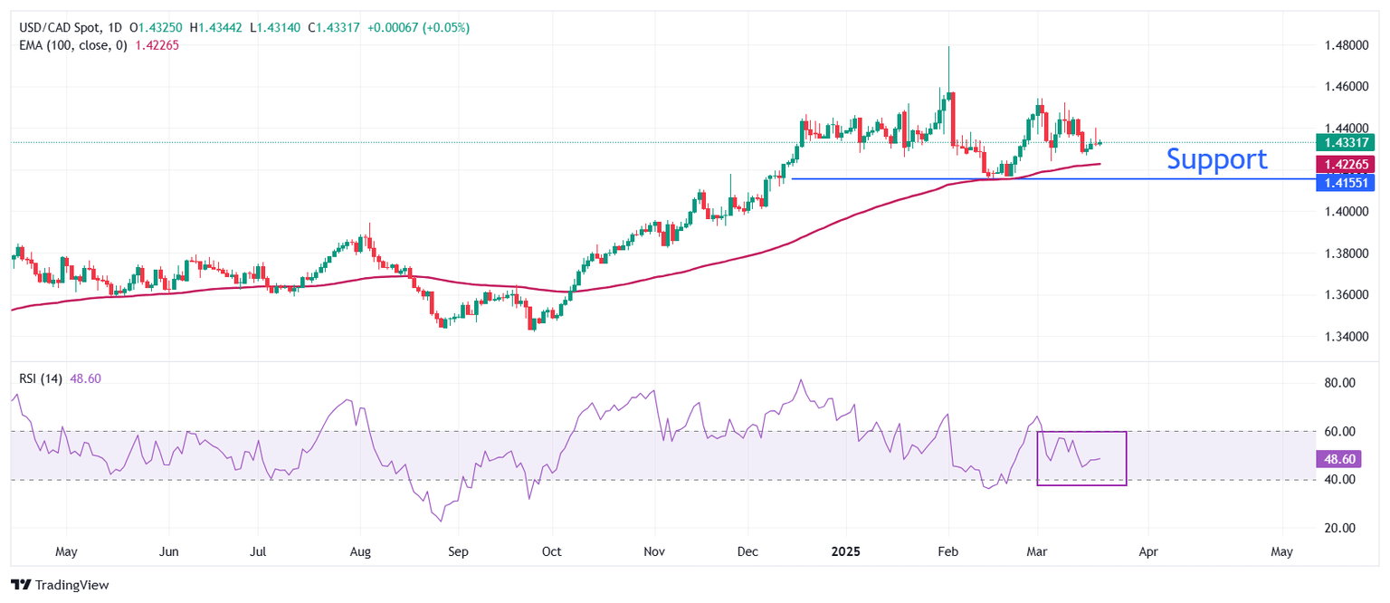 USD/CAD Price Forecast: Trades sideways above 1.4300