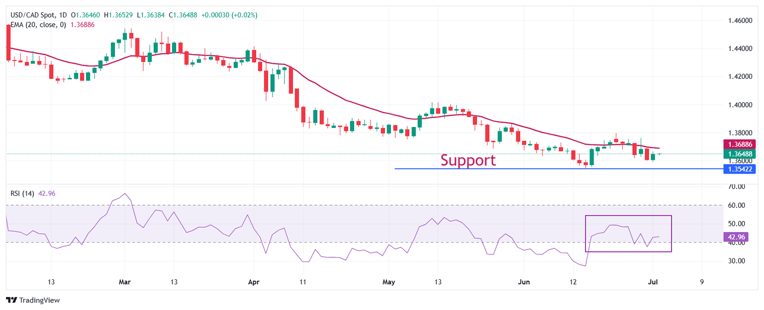 The USD/CAD pair trades in a very tight range near 1.3650 during the Asian trading session on Wednesday. The Loonie trades consolidates as investors await the United States (US) Nonfarm Payrolls (NFP) data for June for fresh cues on the Federal Reserve’s (Fed) monetary policy outlook.