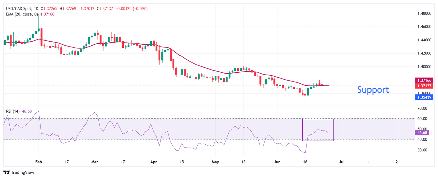 USD/CAD wobbles near the 20-day Exponential Moving Average (EMA), which trades around 1.3717, is suggesting a sideways trend. The 14-day Relative Strength Index (RSI) oscillates inside the 40.00-60.00 range, which indicates a sharp volatility contraction.