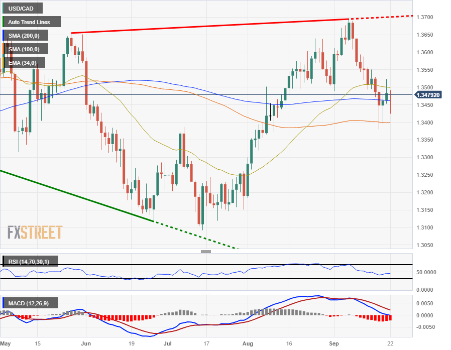 The USD/CAD is set to finish out Friday near where it started, trading just south of 1.3490.