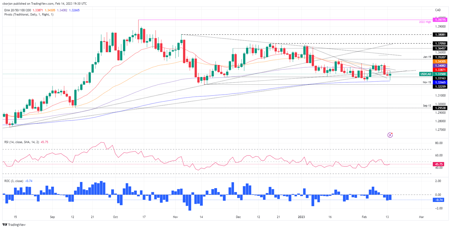 Given the backdrop, the USD/CAD remained on the front foot and was bolstered by falling US crude oil prices, with WTI dropping 1.53%. Money market futures estimate the Federal Reserve will hike above the 5% threshold, expecting the first rate cut by December 2023.