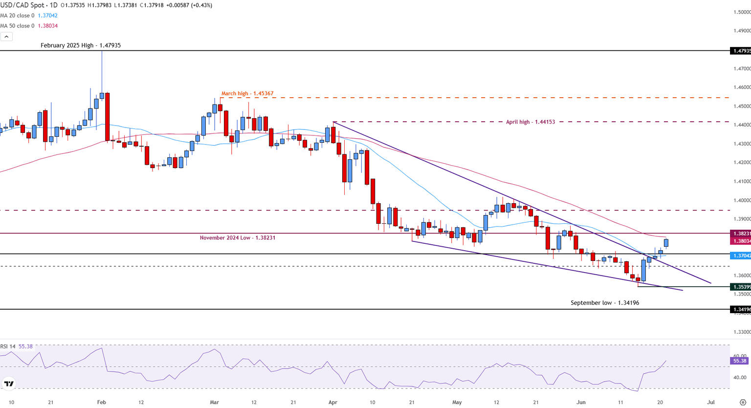 A sustained break above that level could pave the way for a test of the November 2024 low at 1.3823. On the downside, initial support lies at the 20-day SMA at 1.3704, followed by a more significant floor near 1.3640. The daily Relative Strength Index (RSI) is holding just above 55, suggesting neutral-to-slightly bullish momentum in the short term.