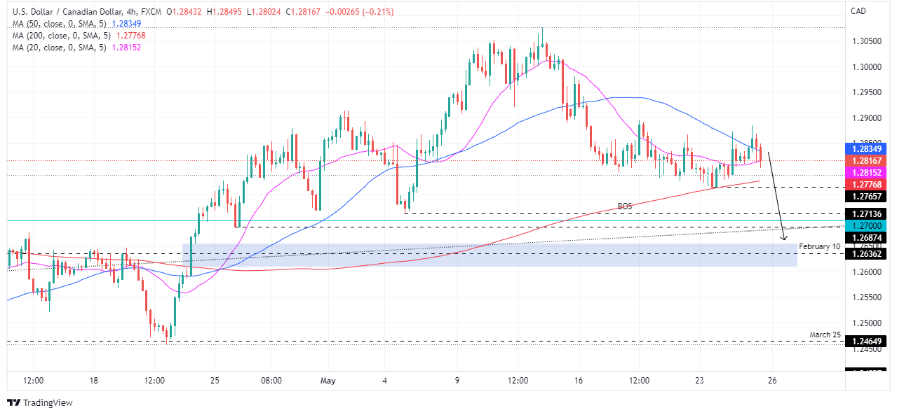 The 4-hour chart depicts the USD/CAD as neutral-downward biased in the short term. From a market structure perspective, USD/CAD bears need to break below the confluence of the May 23 swing low and the 200-SMA around the 1.2765-76 area. If that scenario plays out, that will send the pair towards the 1.2713 swing low; once cleared would expose the February 10 daily low at 1.2636.