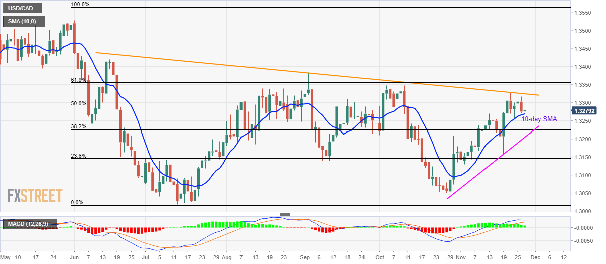 USD/CAD registers another U-turn from 10-day Simple Moving Average (SMA) while taking the bids to 1.3280 during the pre-European session on Wednesday.
