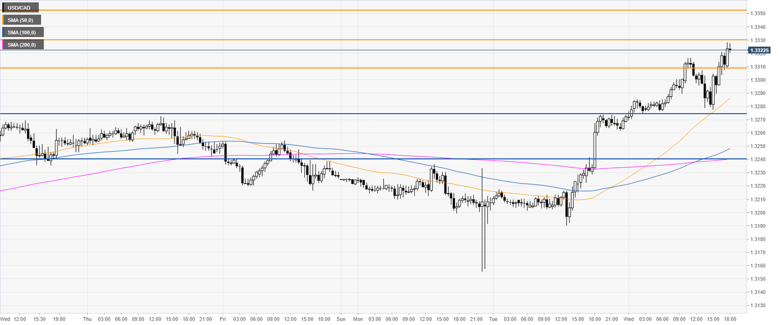 - USD/CAD is spiking to new monthly highs above the 1.3300 handle ahead of the FOMC minutes.