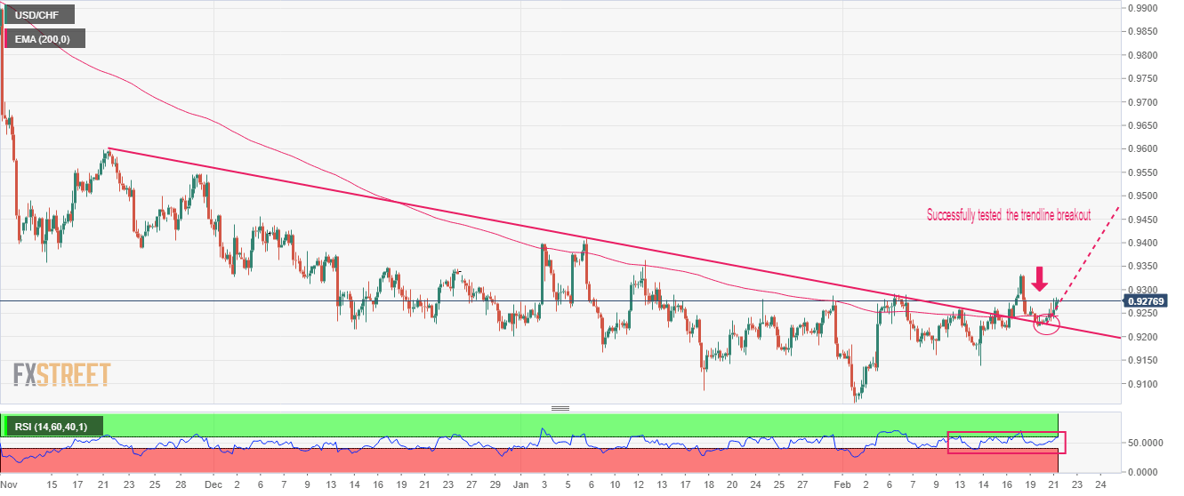 USD/CHF has successfully tested the breakout of the downward-sloping trendline placed from November 21 high around 0.9600 on a four-hour scale. Usually, a successful test of a trendline breakout without solid downside pressure indicates the strength of bulls and prepares a platform for a confident upside move ahead.