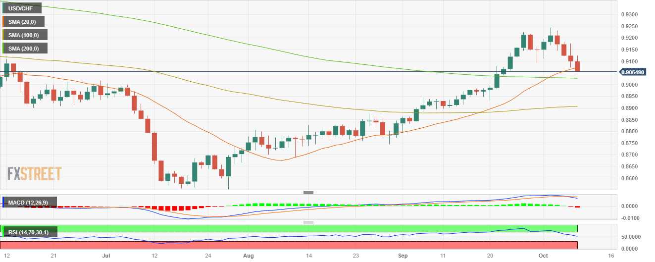 - The USD/CHF initially rose to 0.9123 and then settled near 0.9070 below the 20-day SMA.