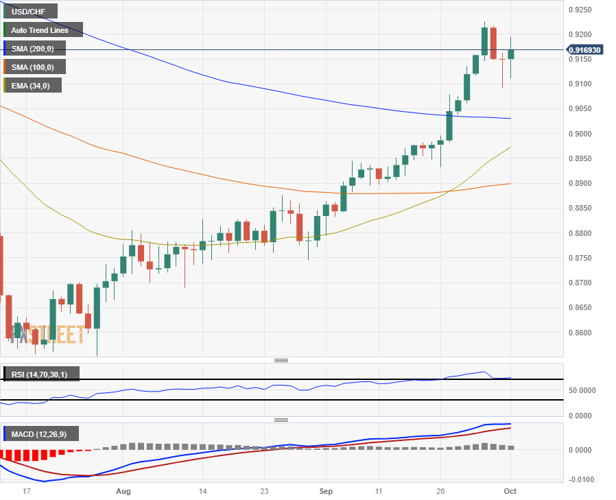 The USD/CHF bounded 85 pips from Monday's early low to mark in an intraday high just shy of the 0.9200 handle, and the pair is currently softening into the midpoint near 0.9170. The pair remains well-bid above the 200-hour Simple Moving Average near 0.9110, but the near-term ceiling remains last week's swing high into 0.9225.