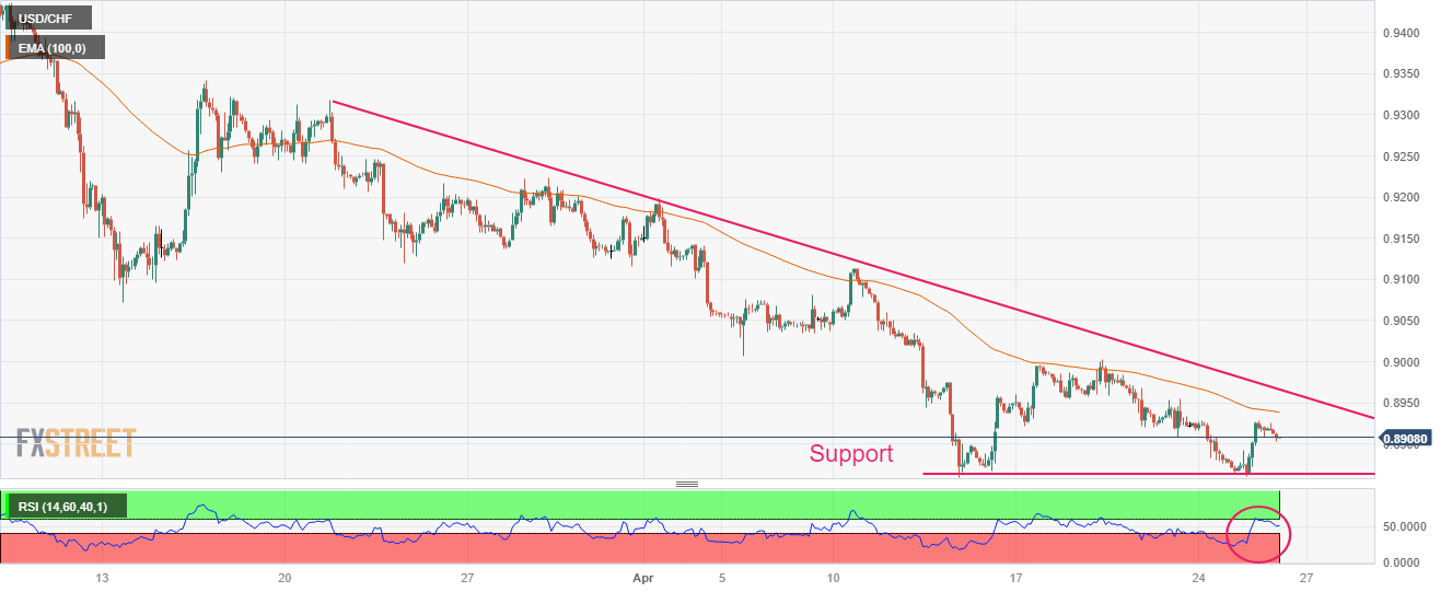 USD/CHF has attempted a recovery after testing prior support levels plotted from April 13 low at 0.8860 with weak selling pressure on a two-hour scale. The 100-period Exponential Moving Average (EMA) at 0.8938 has acted as a major roadblock for the US Dollar bulls. Southward-sloping trendline from March 21 high at 0.9317 will continue to act as a barricade for the greenback.