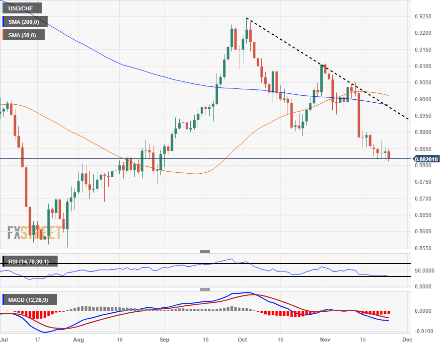 The USD/CHF tracked lower on Friday as broader markets saw an uptick in risk appetite to close out the trading week, bringing the US Dollar (USD) down into familiar lows against the Swiss Franc (CHF) with the 0.8800 handle in full view.