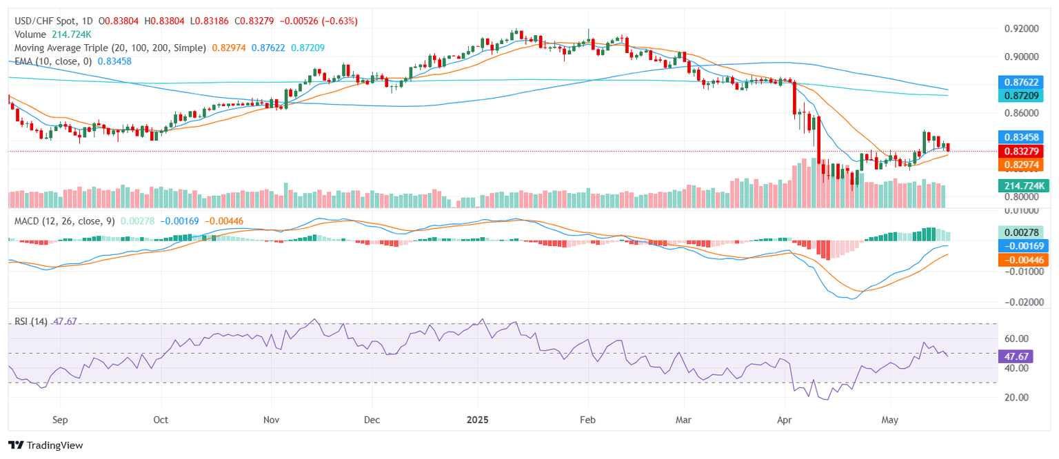 The USD/CHF pair is trading 0.5% lower around 0.8330 during North American trading hours on Monday, reflecting a sharp drop in US Dollar sentiment after Moody's downgraded the United States' long-term credit rating from AAA to AA1. This marks a significant hit to the US Dollar's perceived stability, further pressuring the Greenback amid ongoing fiscal challenges.