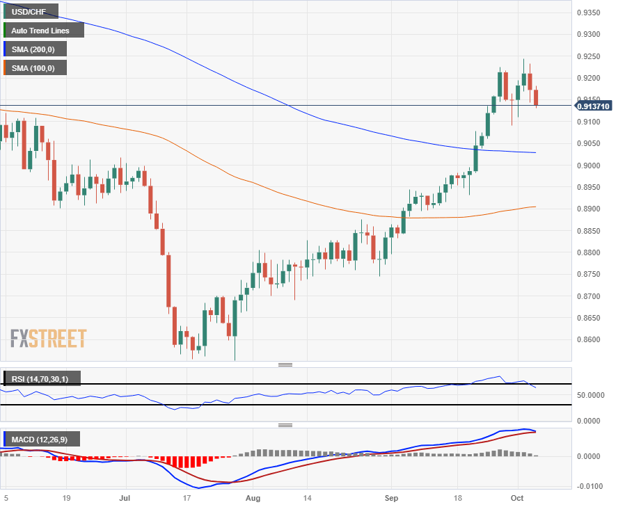 The USD/CHF is down 0.40% or just under 40 pips in Thursday's trading, slipping further back from the recent highs near 0.9250. The Franc has fallen significantly against the US Dollar in recent history, and the Greenback has climbed over 8% against the CHF from the last bottom at 0.8550.