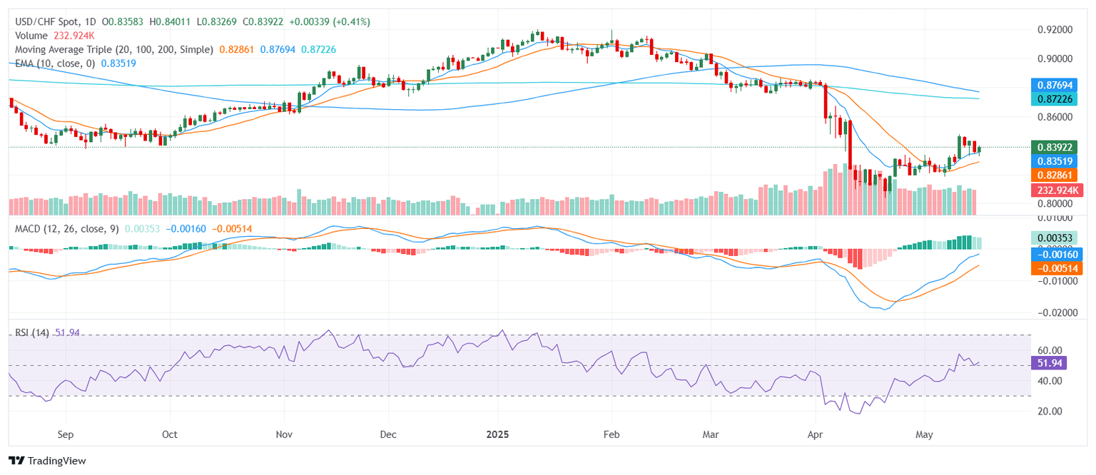 The USD/CHF pair is trading higher on Friday, testing a significant resistance zone near 0.8380 as traders digest mixed economic signals from the United States and ongoing global trade tensions. Despite a modest 0.28% gain on the day, the pair's upside remains constrained by broader concerns over US economic resilience and tariff policy uncertainty. The US Dollar Index (DXY), a gauge of the greenback's performance against six major currencies, is trading flat around 100.80, reflecting a cautious market tone.