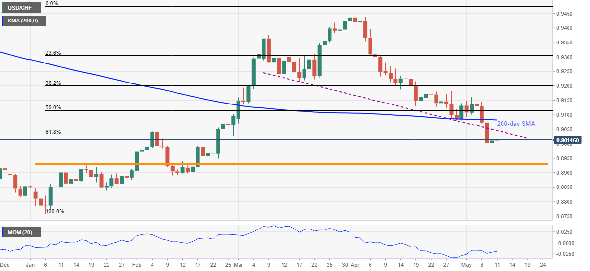 - USD/CHF extends bounce off 0.9001, refreshes intraday top.