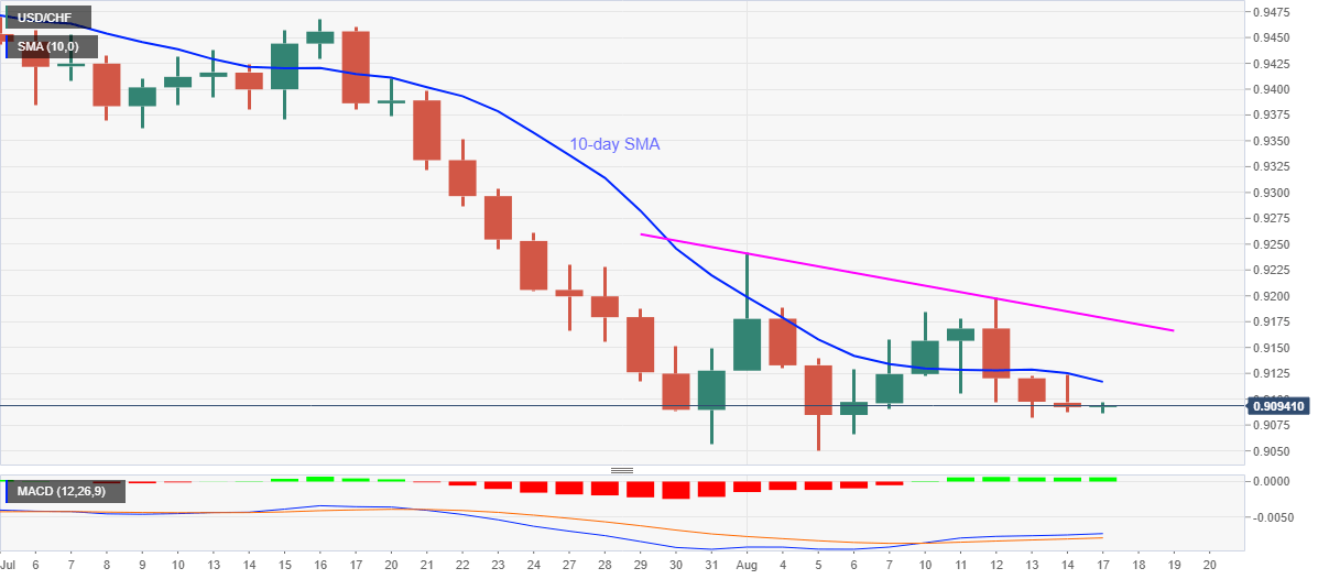 USD/CHF bears catch a breather around 0.9093 during the pre-European trading on Monday. In doing so, the pair stalls the three-day losing streak amid bullish MACD.