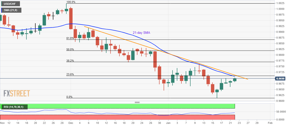 Meanwhile, lows marked on December 31 and January 17 highlights 0.9644 as the immediate support, a break of which could push the bears towards refreshing the 16-month low towards 0.9600 round-figure and then to September 2018 bottom surrounding 0.9540.