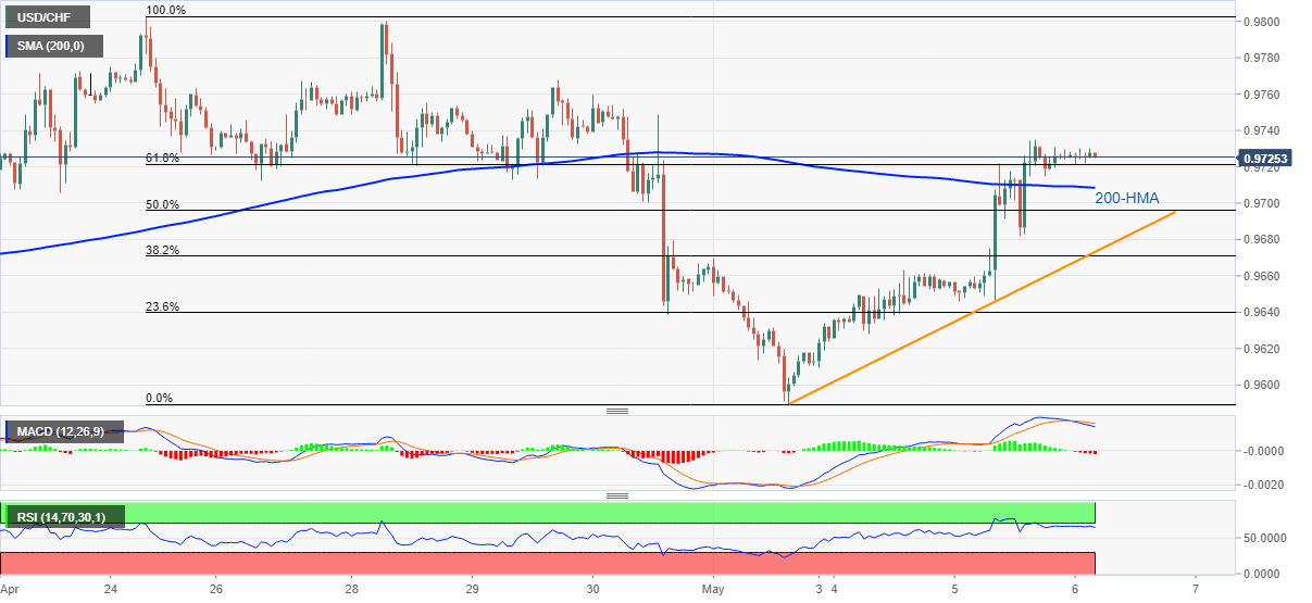 The reason could be spotted in overbought RSI and bearish MACD. As a result, sellers look for entry below 200-HMA level of 0.9708. However, 61.8% Fibonacci retracement of April 24-May 01 fall, near 0.9720, acts as the immediate support.