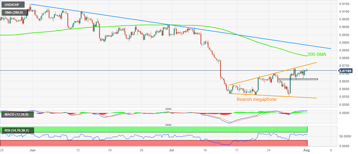 USD/CHF Price Analysis: Bearish megaphone teases Swiss Franc buyers above 0.8700