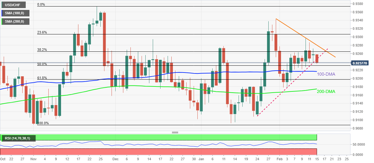 USD/CHF refreshes intraday low around 0.9235, down 0.25% on a day after breaking a short-term crucial support line during Tuesday’s Asian session.