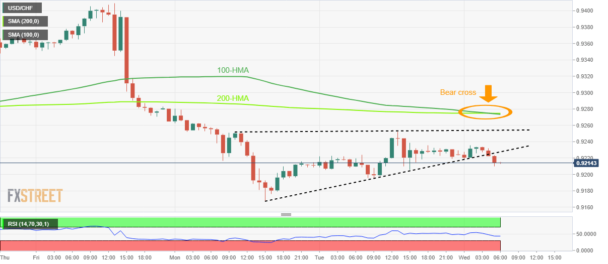 USD/CHF breaks an upward-sloping trend line to welcome bears after the previous day’s brief absence. That said, the Swiss Franc (CHF) pair renews its intraday low around 0.9210 during the early hours of Wednesday morning in Europe.