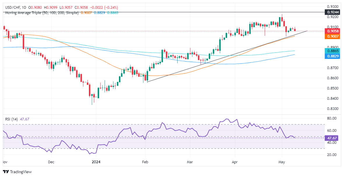 The daily chart depicts the USD/CHF as neutral to upward biased, despite buyers losing momentum, as shown by the Relative Strength Index (RSI) shifting bearish. Although the pair has lost some 1.80% after hitting a year-to-date (YTD) high of 0.9224, solid support seen at the confluence of the 50-day moving average and a support trendline at around 0.9006/30 might cap the pair’s drop.