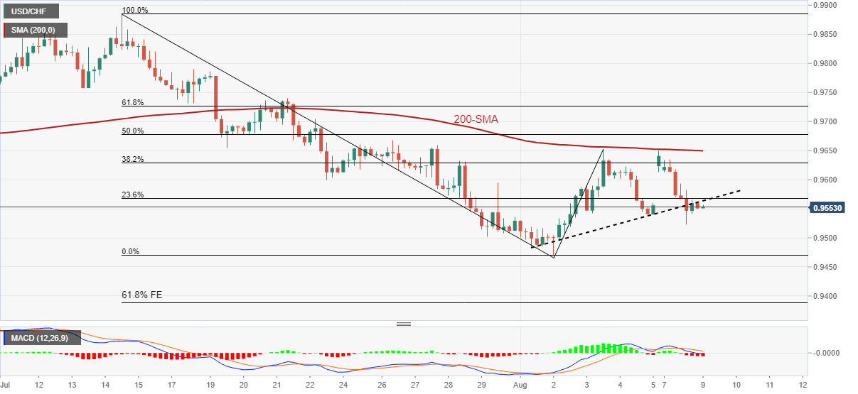 USD/CHF remains depressed around 0.9550 amid a sluggish Asian session on Tuesday. Even so, the sellers remain hopeful while tracing a downside break of a one-week-old ascending trend line.