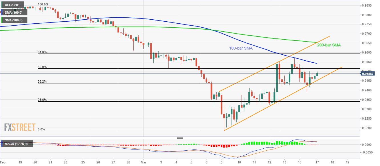- USD/CHF holds onto recovery gains inside the short-term bullish technical pattern.