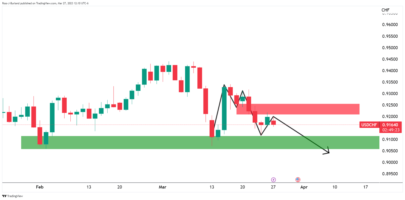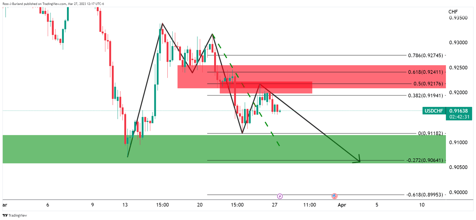 USD/CHF is down 0.35% after the Swiss National Bank moved forward with a 50bps increase in borrowing costs as expected last week, citing a renewed rise in inflationary pressure and discarding the recent turmoil in the banking sector and the Credit Suisse takeover.