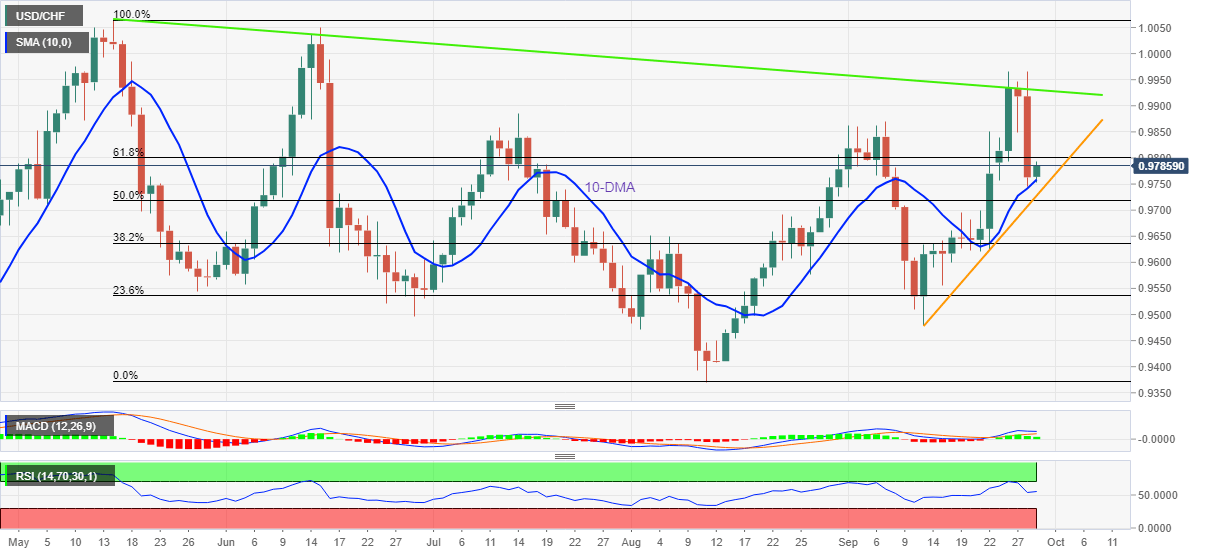 USD/CHF picks up bids to refresh intraday high around 0.9790 during Thursday’s Asian session while printing the first daily gain in three. In doing so, the Swiss currency (CHF) pair rebounds from the 10-DMA, as well as the weekly low, to pare the biggest slump since mid-June.