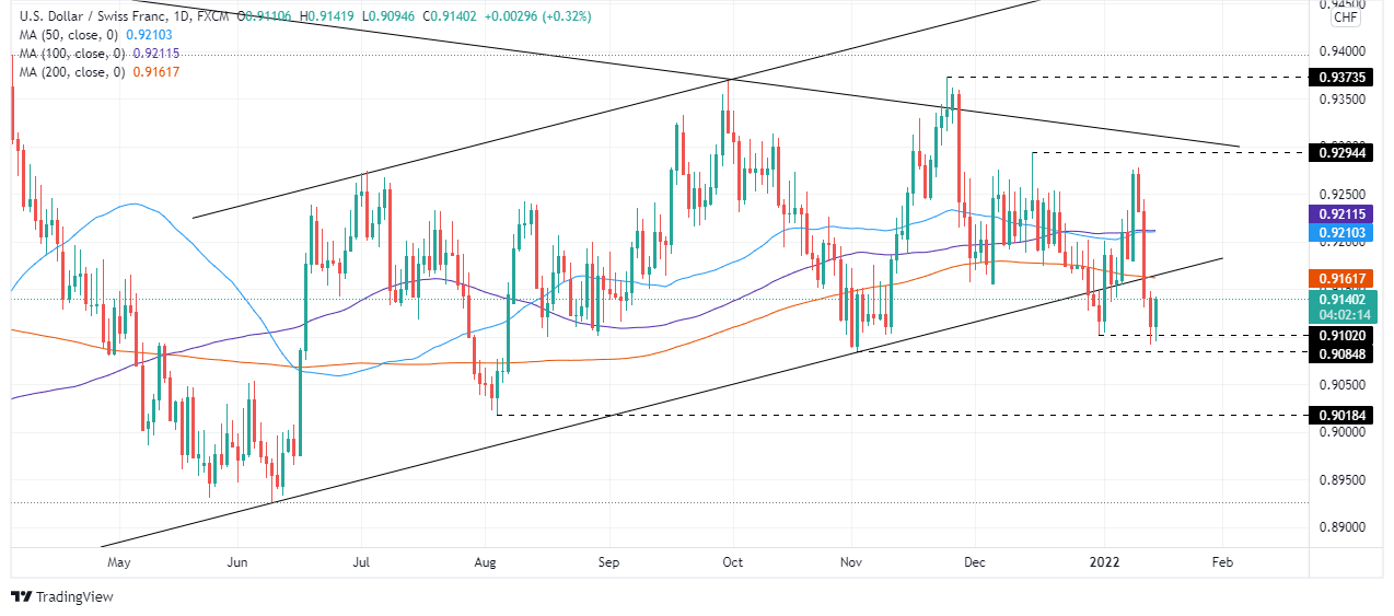 If USD/CHF Friday’s daily close engulf Thursday’s candlestick price action, an upward move may be on the cards. In that outcome, the first resistance would be the 200-day moving average (DMA) previously broke at 0.9167. An aforementioned break would expose the confluence of th3 50 and the 100-DMA in the 0.9210-12 range, which once gave way to USD bulls, would send the pair rallying towards December 15, 2021 daily high at 0.9294.