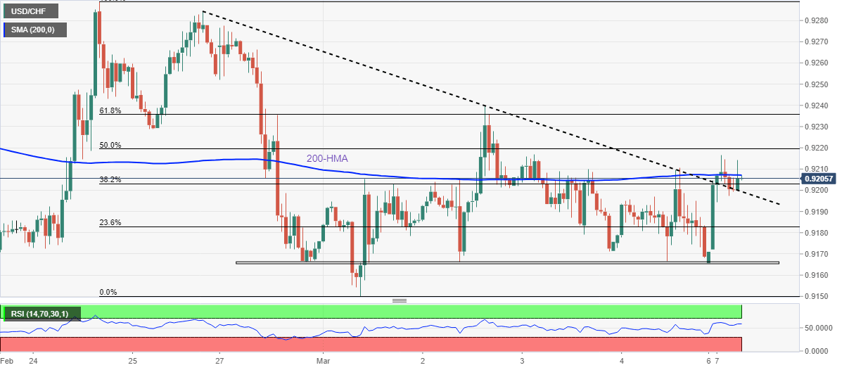 USD/CHF struggles to justify descending triangle breakout above 0.9200 during early Monday morning in Europe.