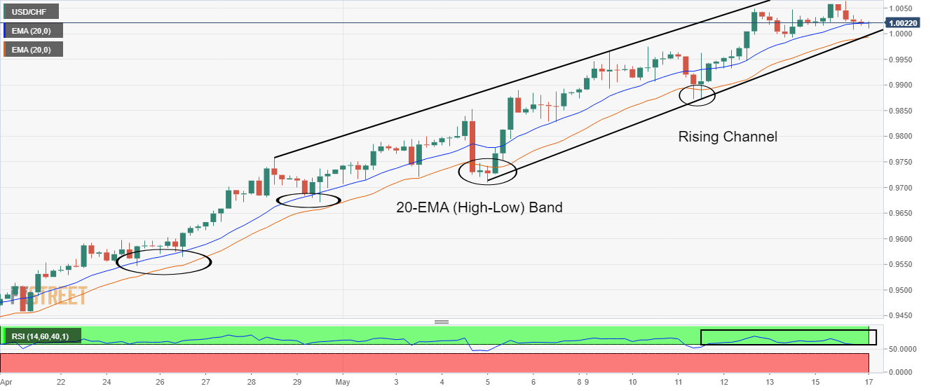 The pair has been displaying a perpendicular rally right from the first trading session of April. On a four-hour scale, the asset is trading in a Rising Channel chart pattern whose upper boundary is placed from April 28 high at 0.9759 while the lower boundary is plotted from March 5 low at 0.9710. The 20-period (High-Low) Exponential Moving Average (EMA) band has been a major cushion for the greenback bulls.