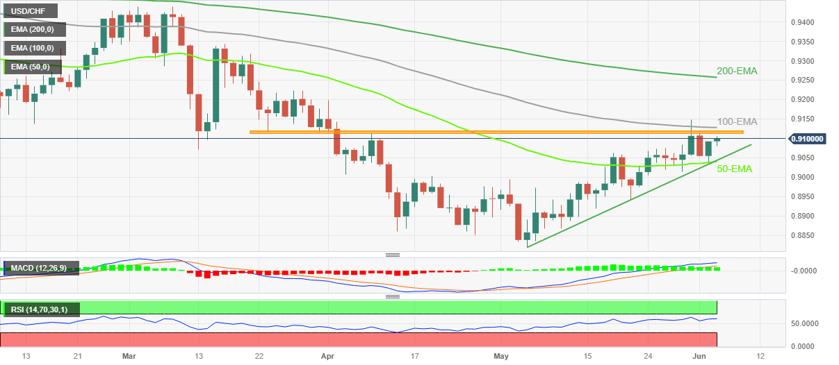 USD/CHF Price Analysis: Bulls prod 0.9100, further upside appears difficult