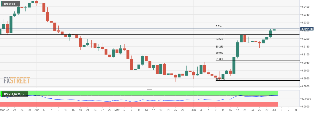 Alternatively, if price reverses direction, in that case, the first target for USD/CHF bears could be the 0.9250 horizontal support level.